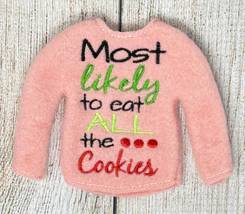 Most Likely to eat ALL the Cookies! A fun sweater for your elf or doll to wear!