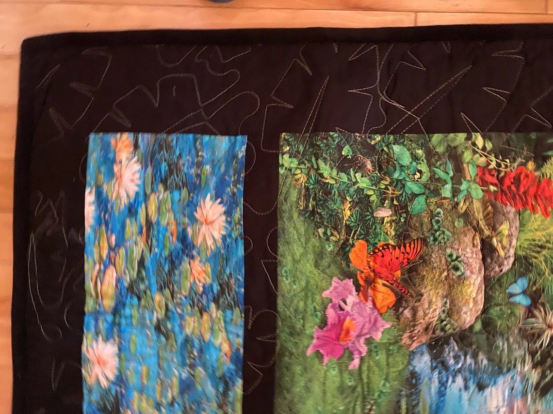 Perfect for any Elephant lover! This quilt is made with care using cotton fabrics on the top, Hobbs Heirloom Cotton batting in the middle which gives extra warmth, and a soft cuddly black colored minky on the back. I used a jungle leaves quilt pattern to compliment the theme of this quilt.