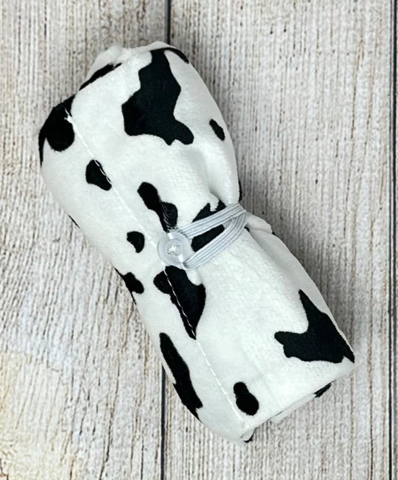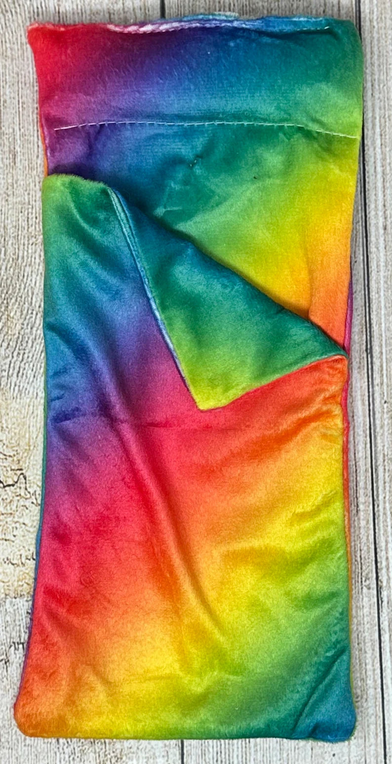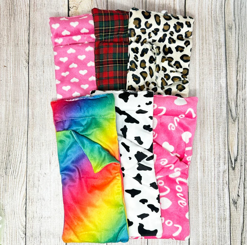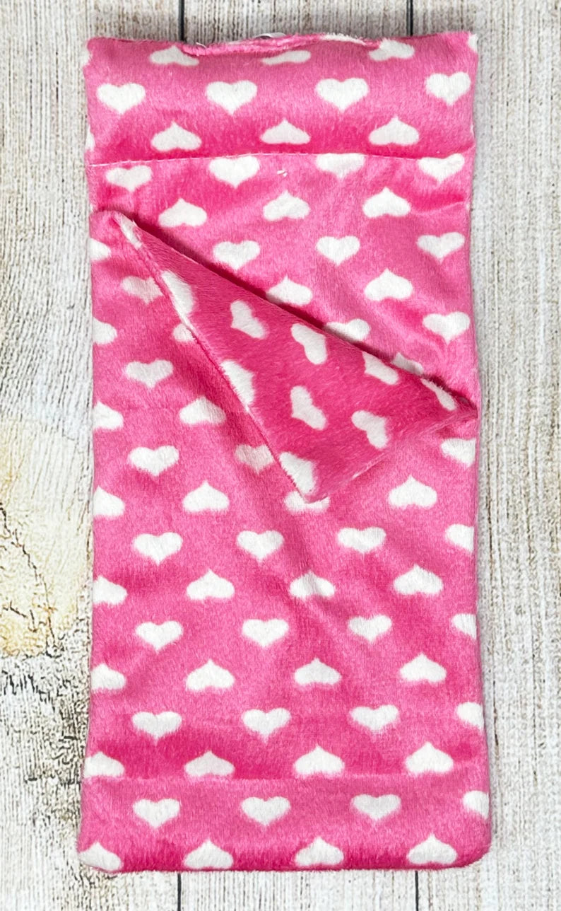 Sleeping bags fit 11-12 inch dolls. They are so cute and soft. The red plaid sleeping bag is made of cotton fabric, all of the other sleeping bags are made of super soft minky. The each have one raised pillow end and a folded over area on one side so it is easier to get the doll in and out.