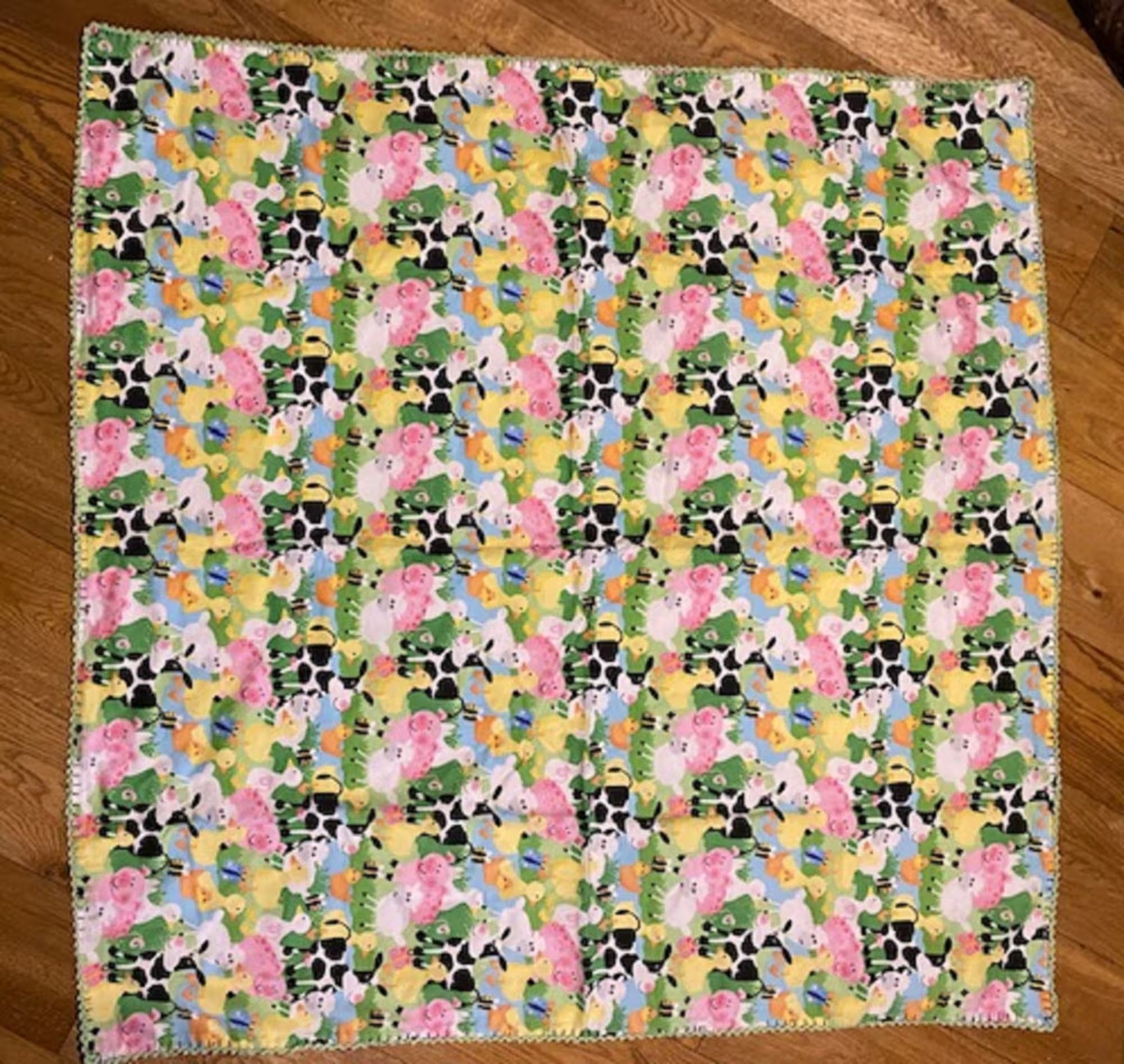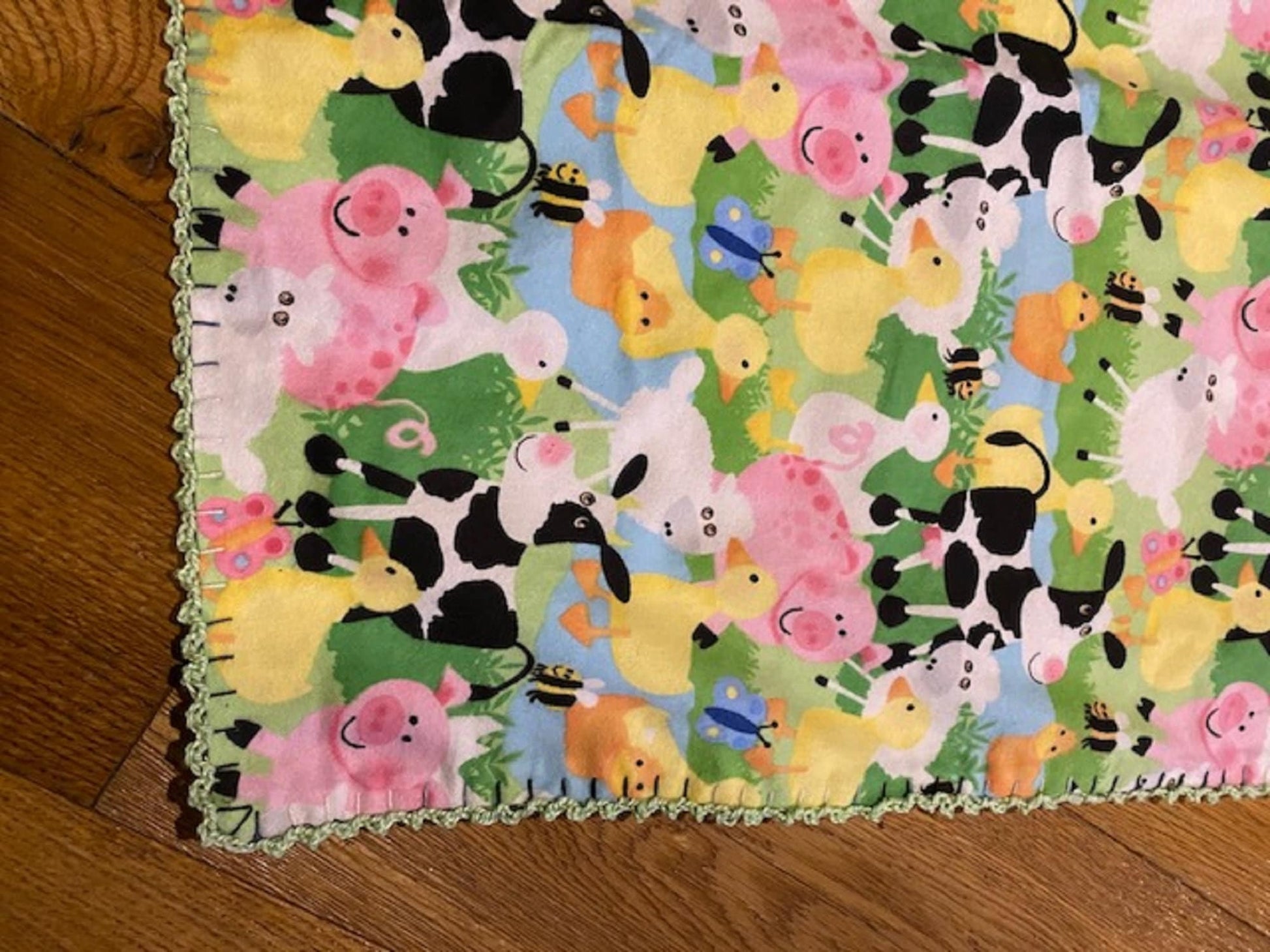 Flannel top with farm animals that has a cute flannel cow print backing. I hand crocheted the edge on this blanket in a soft grey color.