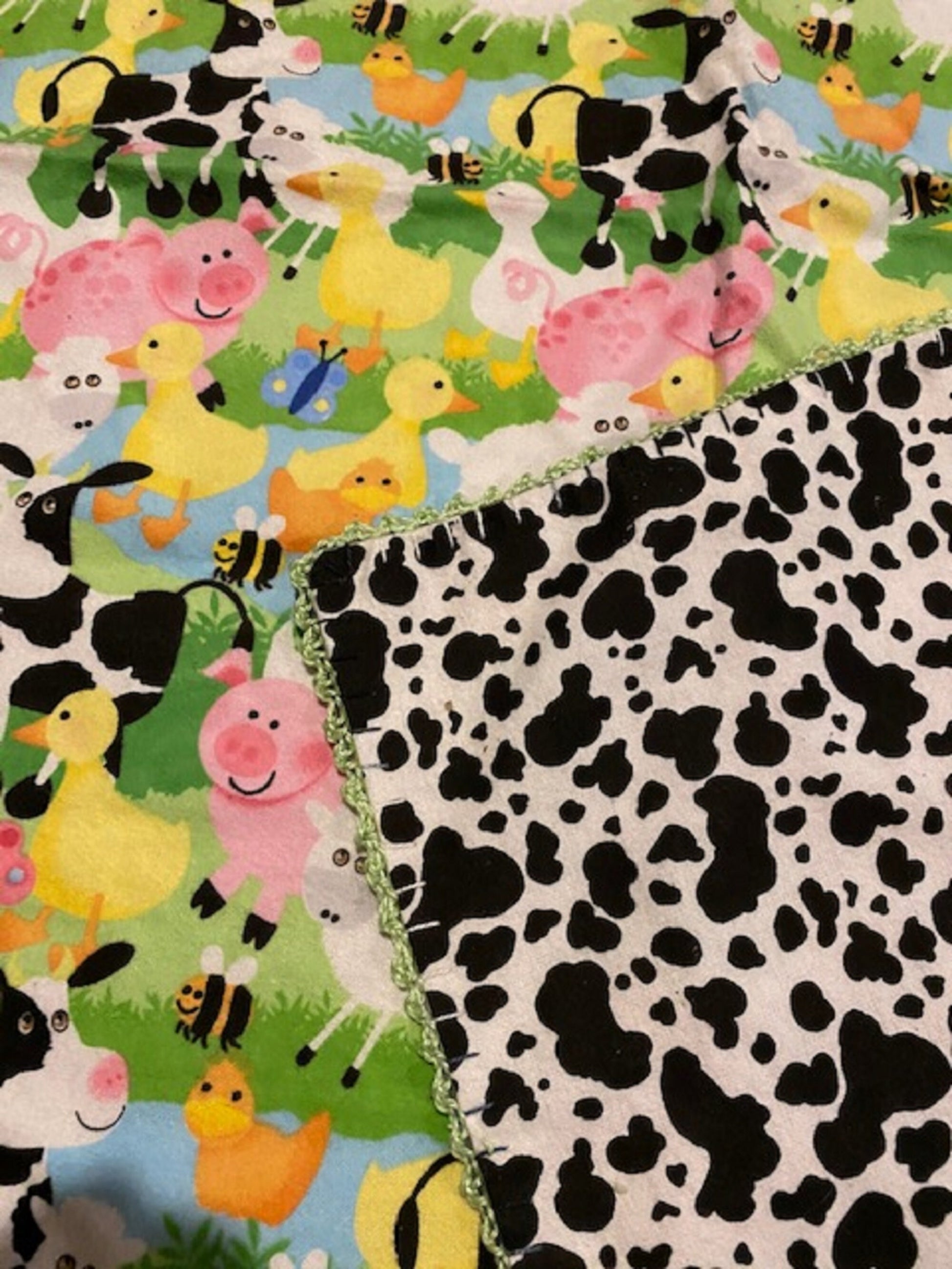 Farm Animals Flannel Receiving Blanket, Cow print flannel back, double flannel, hand crocheted 42" x 42"