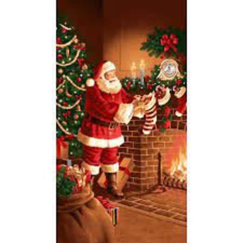 Santa Filling Christmas Stockings. A fun fabric panel in use as a wall hanging or incorporate into a special Christmas quilt.