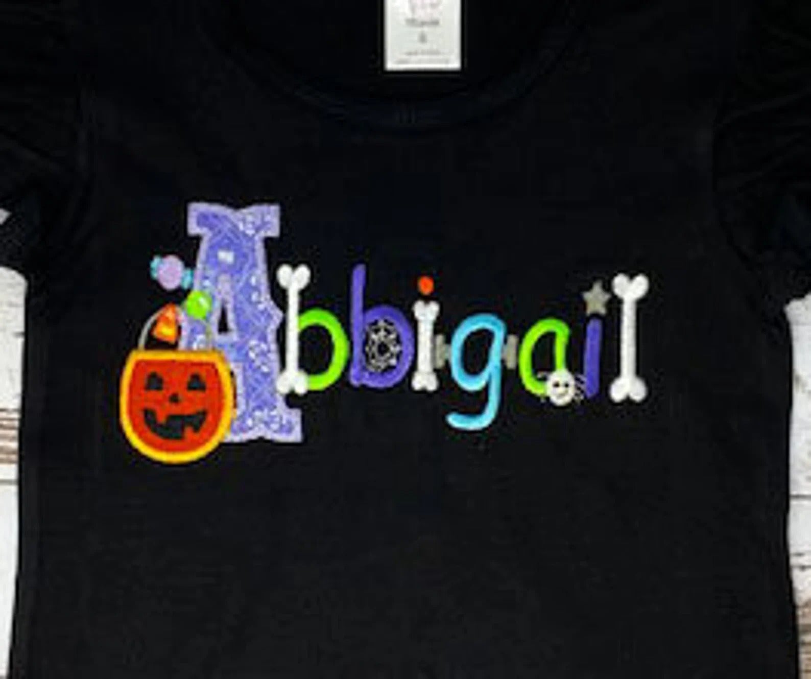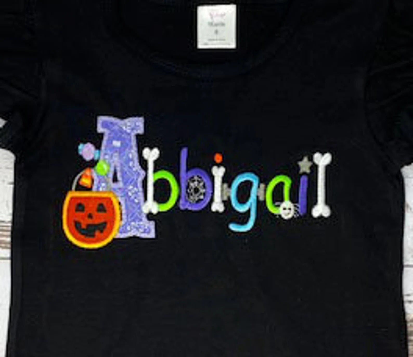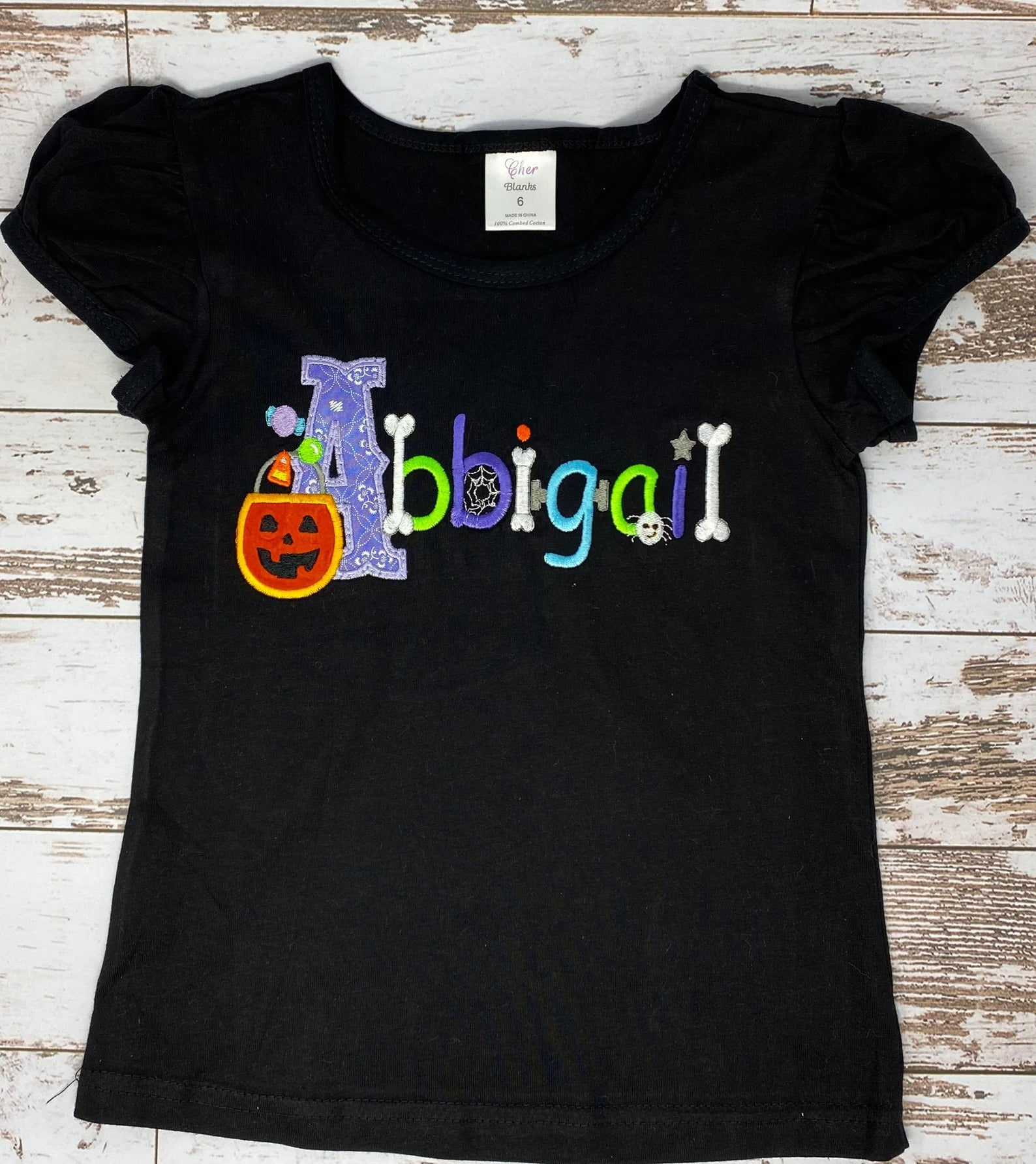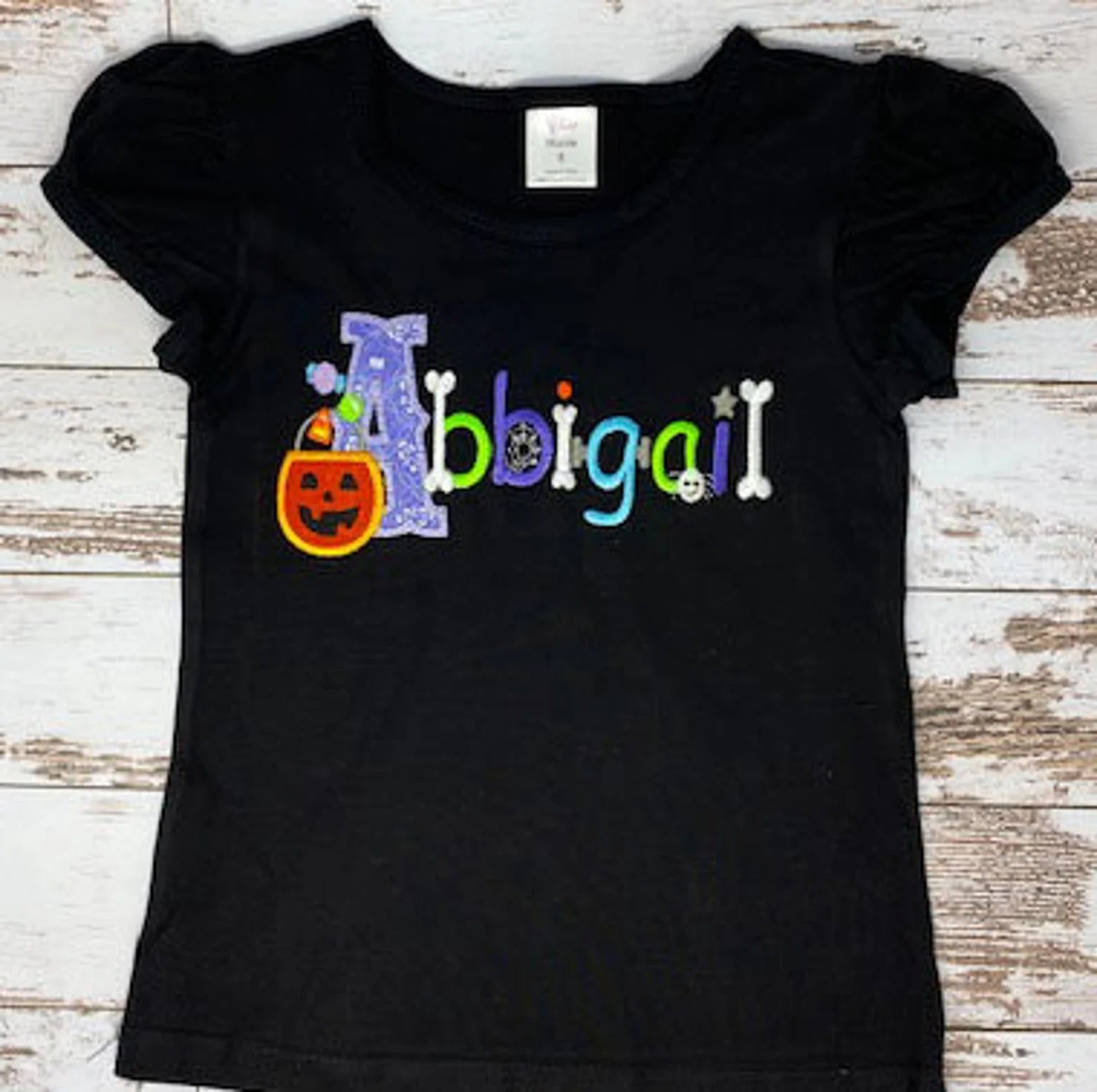 This is a super cute idea for a Halloween Shirt. It features all kinds of different Halloween Designs like bones, spiders, and more in the alphabet letters of your child's name. The first letter of the name you choose is the biggest and has a pumpkin pail with candies spilling out of it! So much fun for your child to wear in Fall!