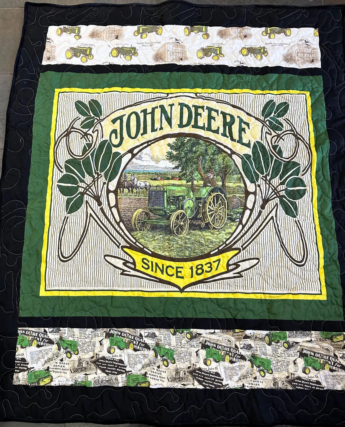 Awesome John Deere quilt featuring vintage logos, sign, and equipment! Awesome blast from the past!