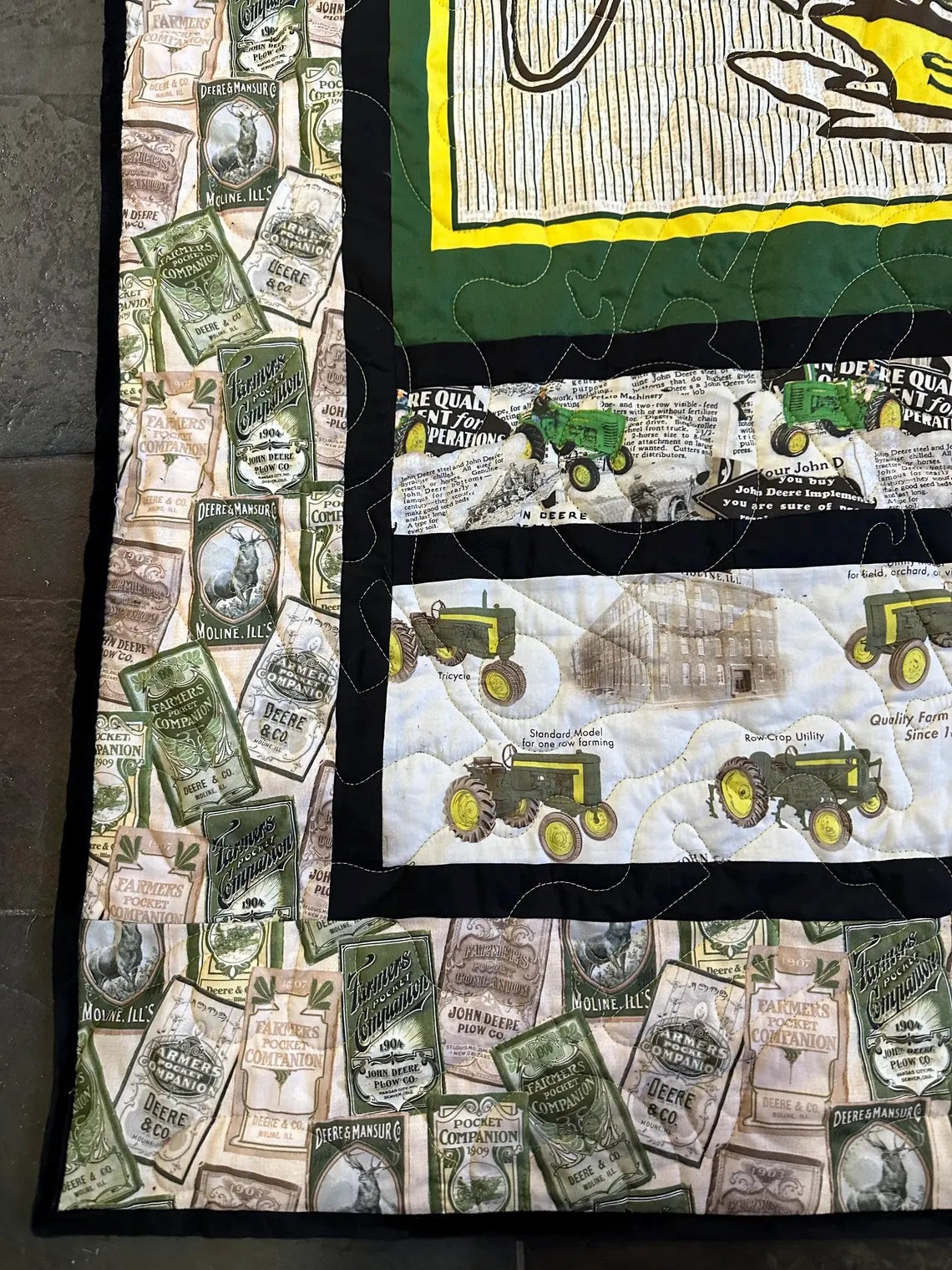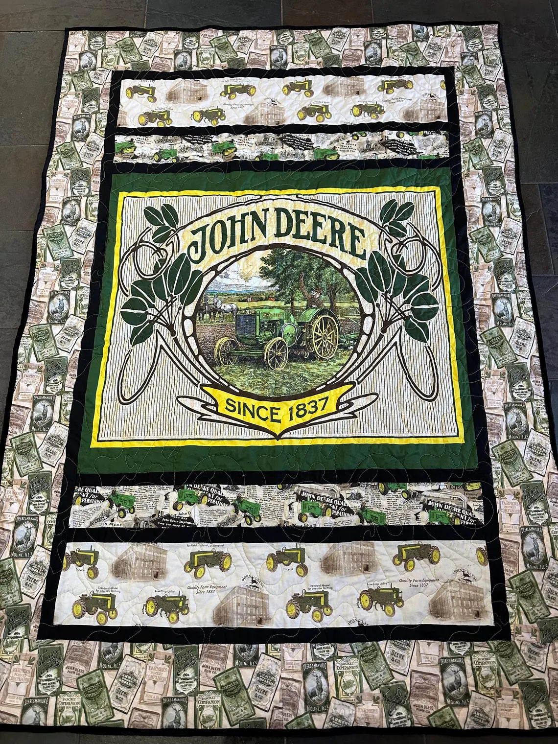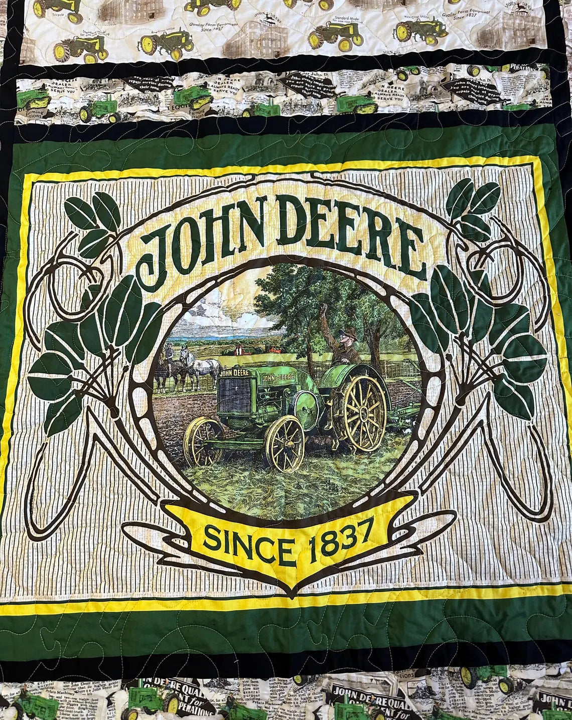 Awesome John Deere quilt featuring vintage logos, sign, and equipment! Awesome blast from the past!