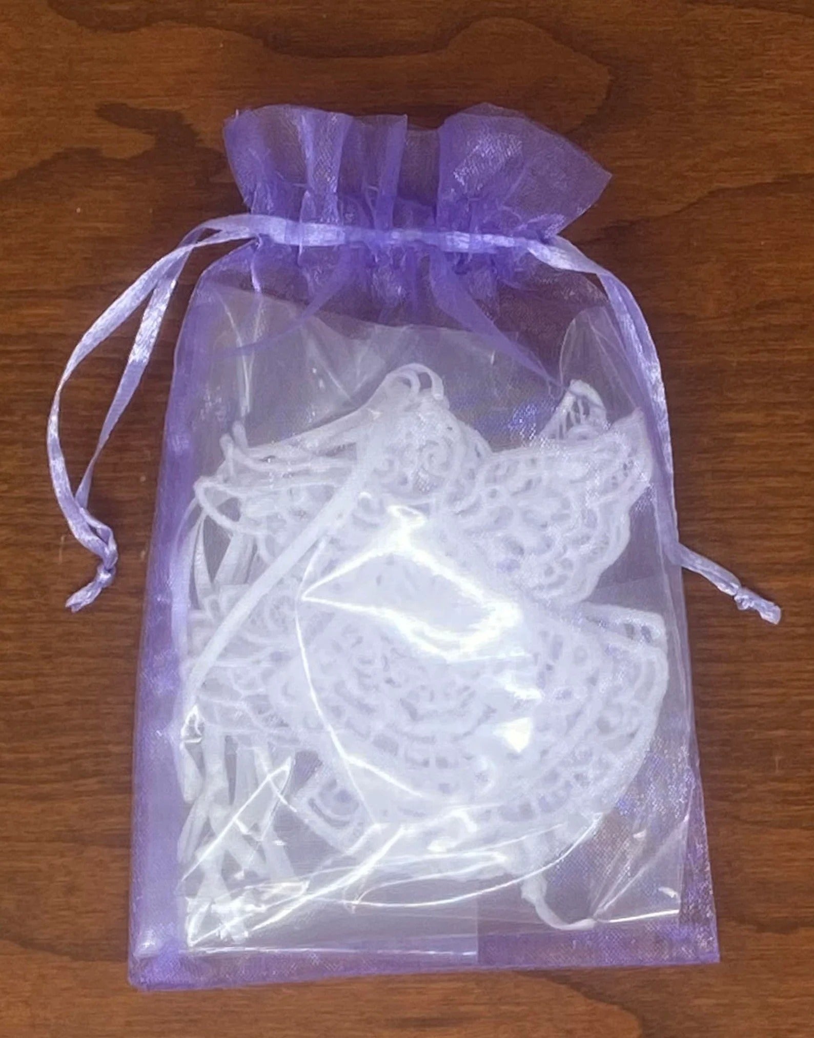 Gorgeous embroidered lace Angels are perfect for decorating your tree, garland, and handrails. All 10 Angels are a different design; no two are the same! They are flat and stiff so they make a perfect gift to add to your Christmas cards and other gifts. These ornaments are free standing lace and are machine embroidered. If you wish to press them please use a pressing cloth and a dry cool iron; do not iron directly on the lace! The snowflakes are approximately 2 3/4" x 2 3/4" and come with a removable white ribbon. This set of ornaments is packaged in an organza bag perfect for gift giving.