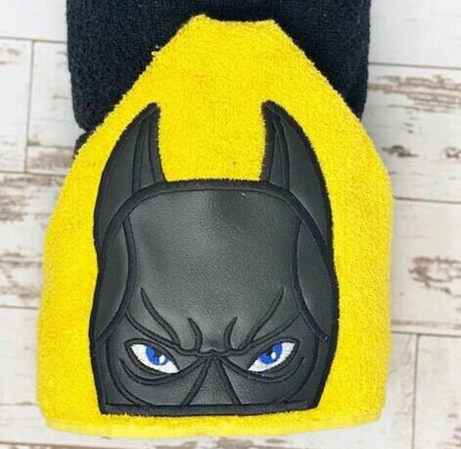 Hooded Towels are made with vinyl fabric for the characters and top quality towels for the hood and bath towel bottom. I use full size bath towels measuring approximately 30" x 54".