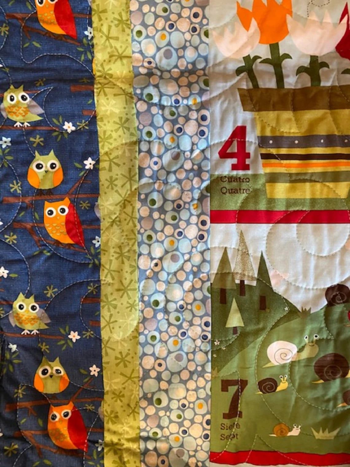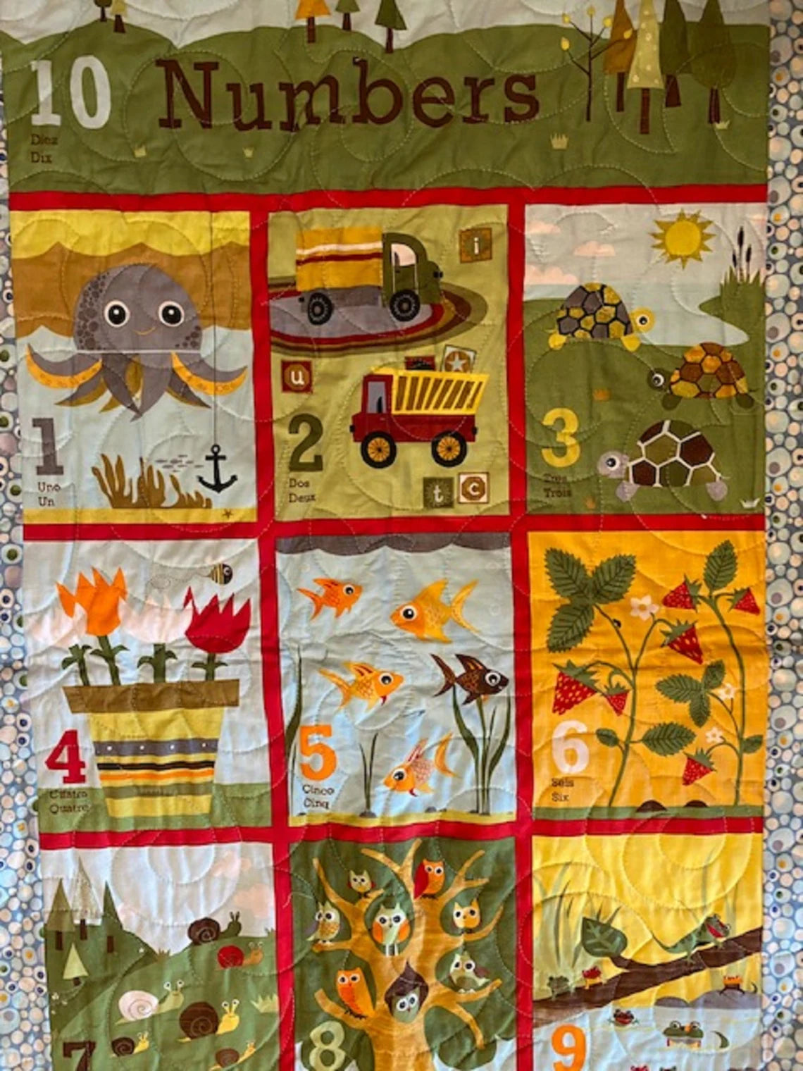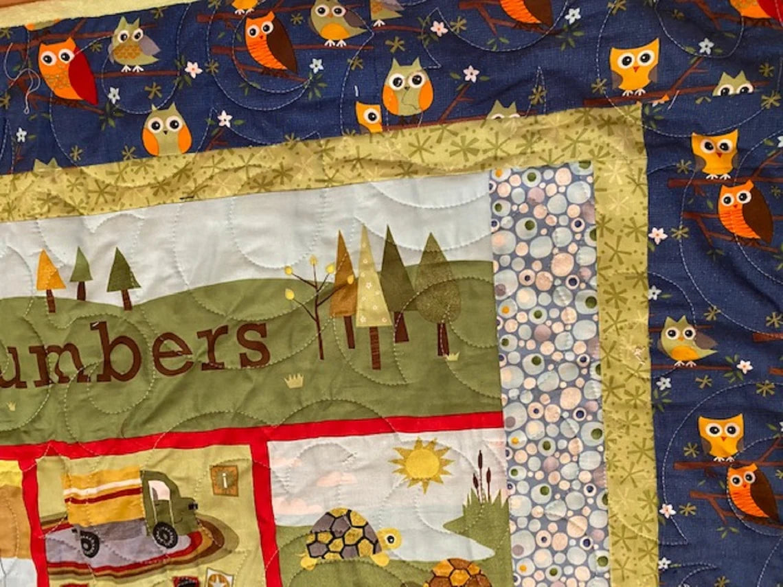 The cutest forest animals number quilt featuring an owl border. This quilt features mostly primary colors. Soft and cuddly this quilt will be sure to become a favorite for many years. I used a allover leaf pattern in the quilting keeping with the forest theme. Hobbs Heirloom Cotton Batting and super soft minky in a celedon color finish this quilt. I work in a professional studio with top quality fabrics and equipment, including a new APQS quilting machine. Non smoking pet-free home.