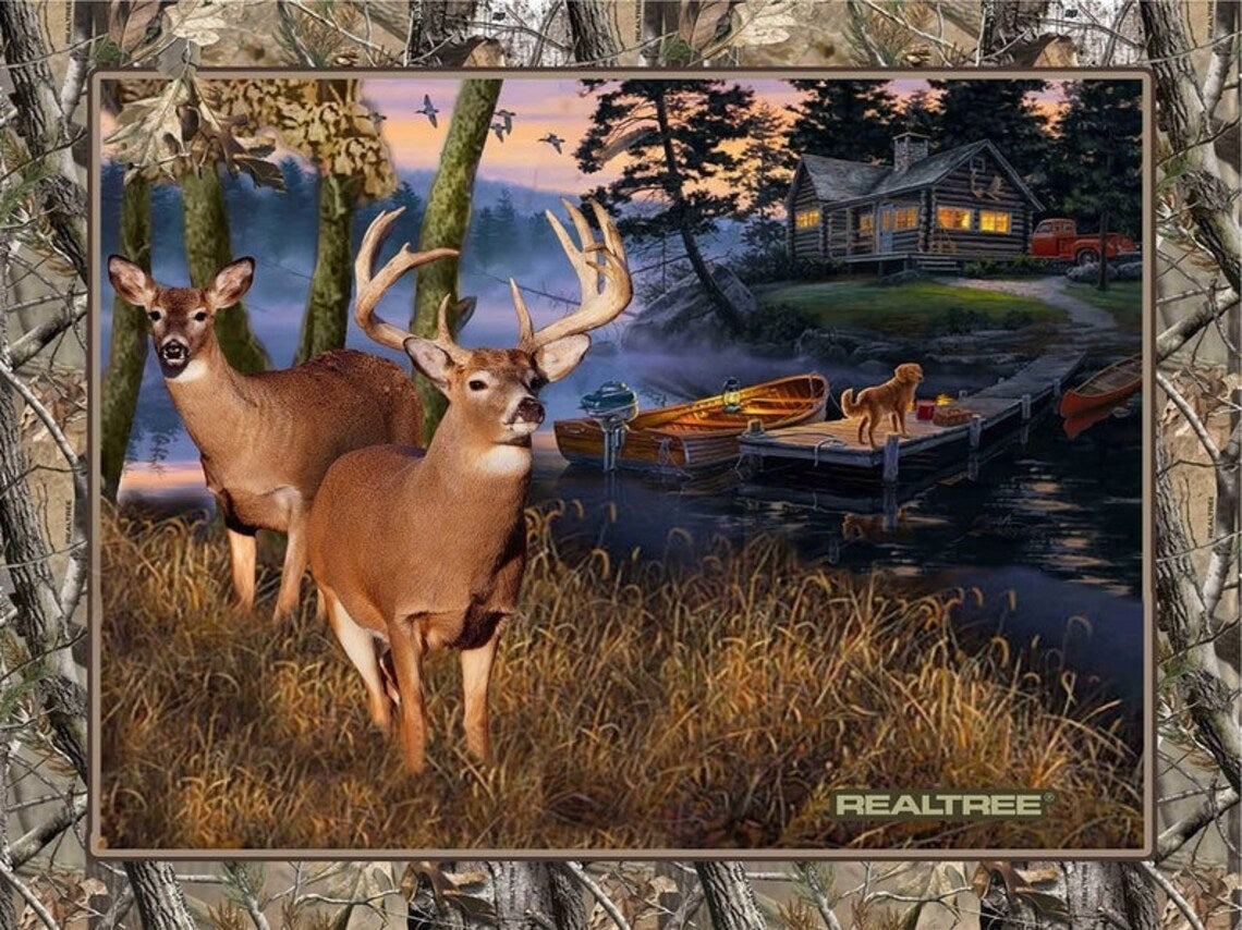 Realtree Deer 36" x 44", Deer Motorboat, Red Canoe, Red Truck, Log Cabin, Realtree Fabric Panel