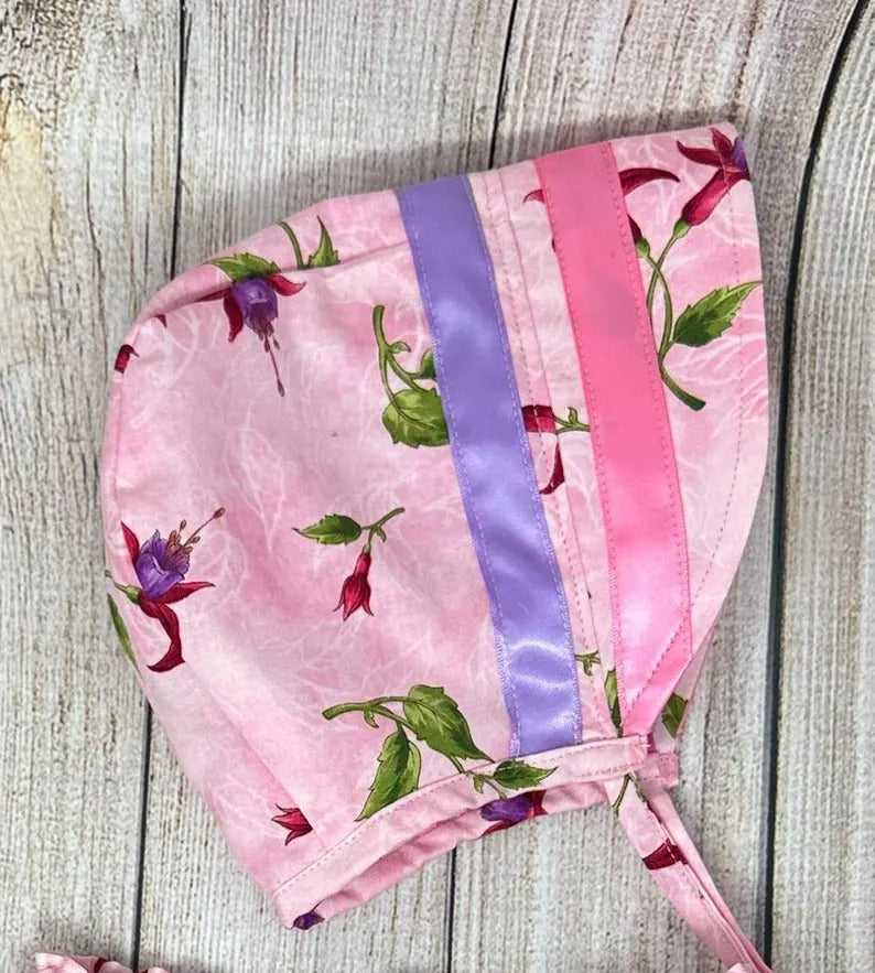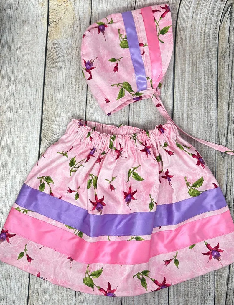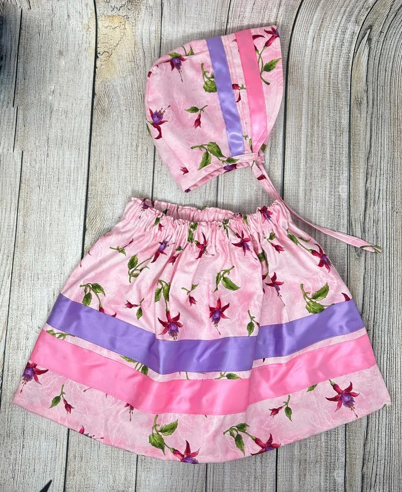 Ribbon Skirt Bonnet Indigenous Infant Gift Set, Baby Girl OOAK Indigenous, Size 0-6 Months, Fushia Floral Skirt and matching Bonnet