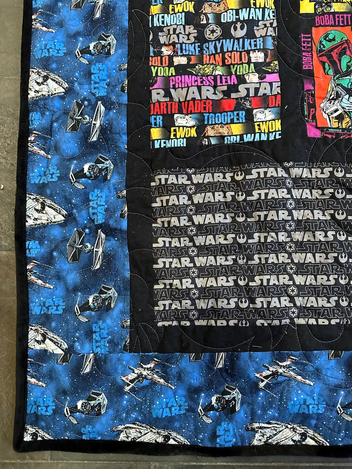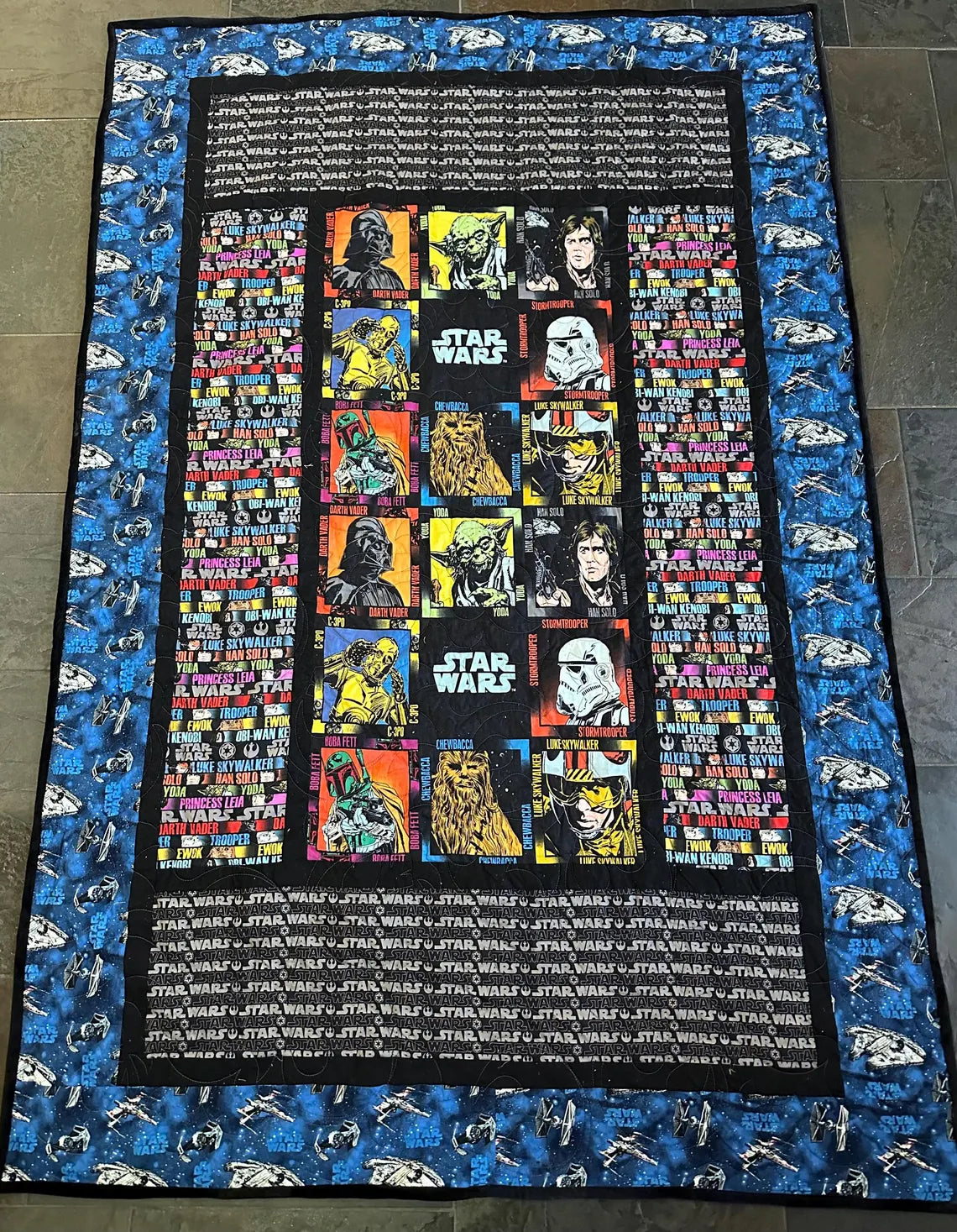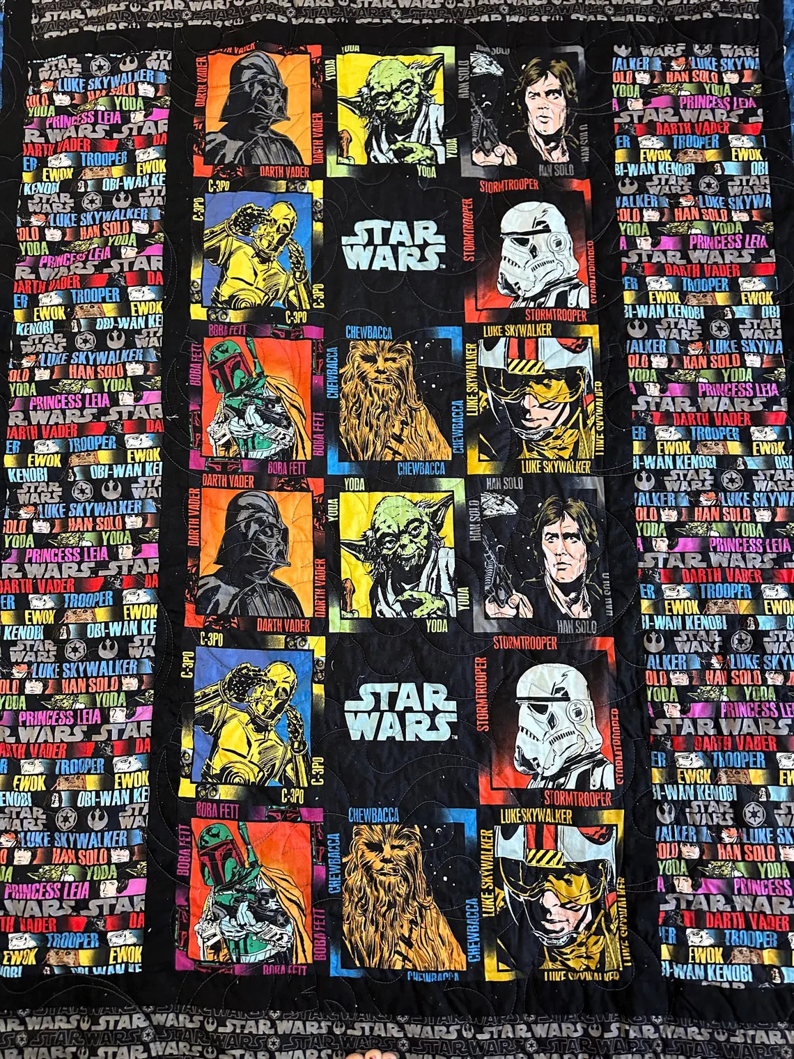Awesome Star Wars quilt featuring the original characters we all grew to love in the movies! Awesome blast from the past!