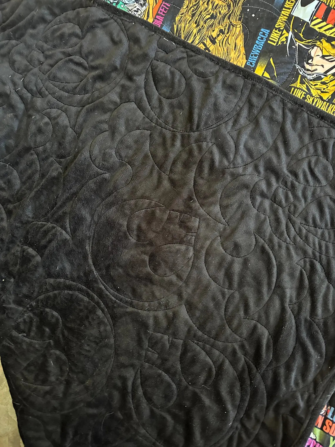 I used soft minky for the backing of this quilt which is very popular for comfort and sensory. I also used a Stars Wars logo for the quilting. Soft cotton Hobbs batting so it is breathable and very comfortable winter and summer.