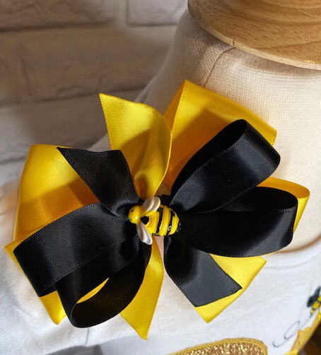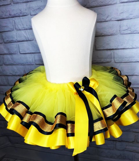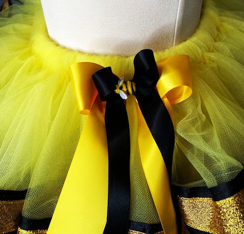 Sunflower and Bees, Sunflower Tutu Set, 2nd Birthday Shirt, Fall Birthday, Sunflower Birthday Shirt, Sunflower Bee Skirt I used a puffed sleeve shirt for this design pictured. Puffed Sleeve Bodysuits are available up to available up to size 2T. Size 12M and up are available in puffed T-shirts which are shown in the chart provided. I use boutique quality t-shirts which are top quality 100% cotton shirts. They are super soft and fitted for little girls! Shirts do run true to size but please see size chart in the photos! Shirts are made to order and the design is embroidered by me in my studio. This cute Tutu features two layers of ribbon, one black with a strip of glitter gold, and the other bright yellow. Perfect for the cutest Sunflower and Bees Tutu set! Shirt, Tutu, and Hairbow are also all available separately. Colors may vary slightly due to the screen you are using. Please remember to include NAME you want embroidered in the personalization section. A sample name in the font I use is included in the pictures. Tutu sizes and measurements are as follows: AGE: WAIST LENGTH 6-12 months 16" 6" 12-18 months 17" 6" 2 T