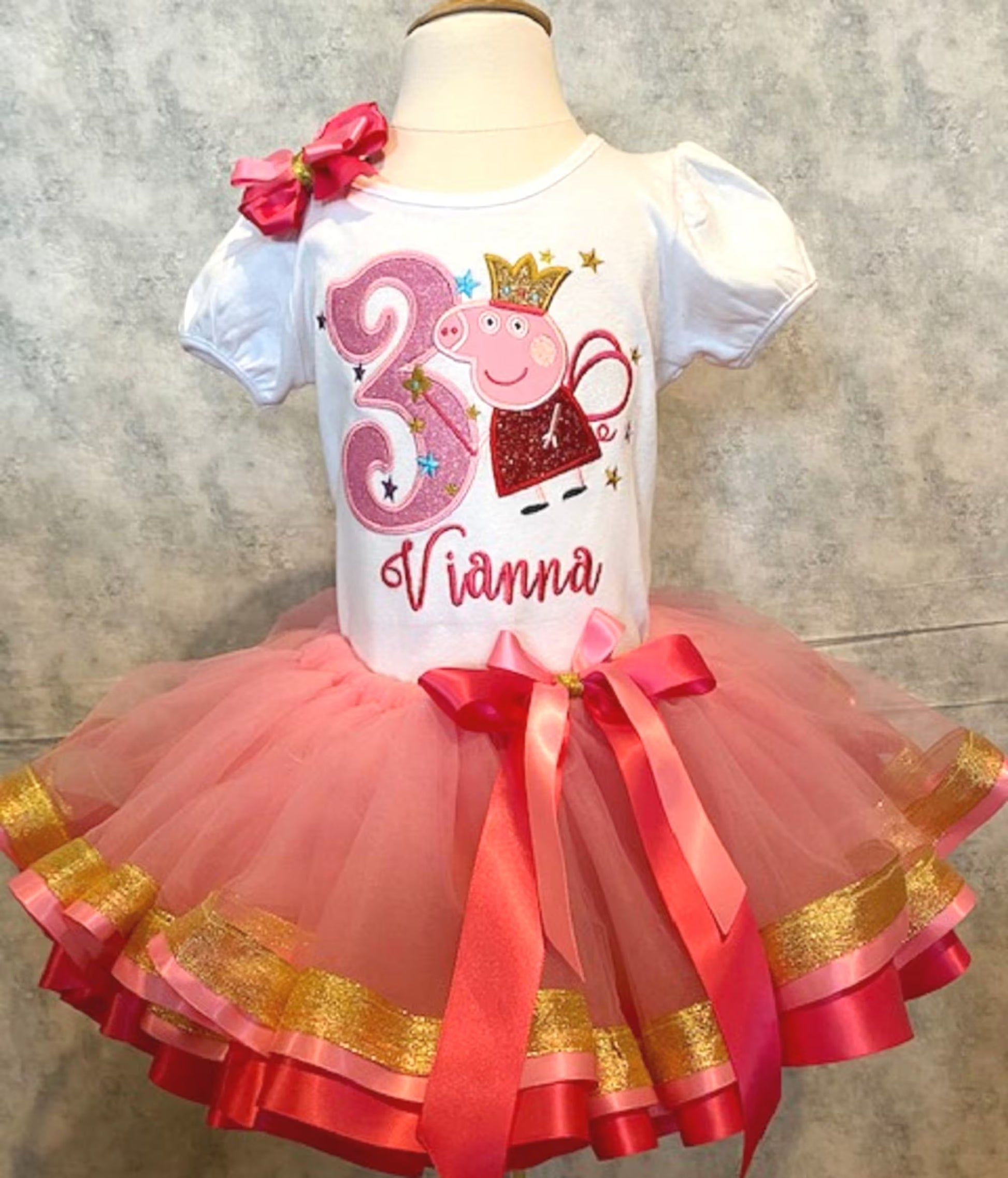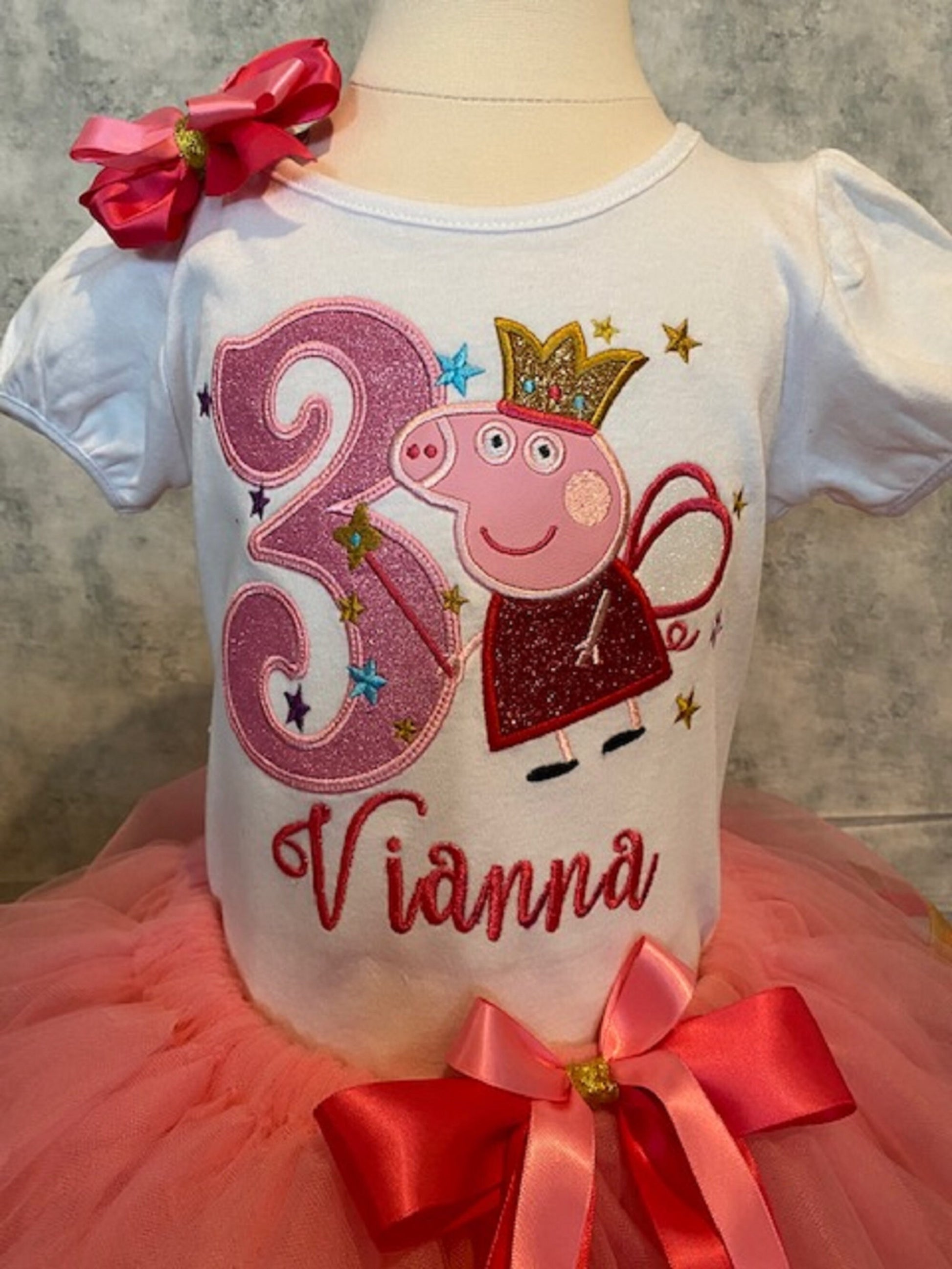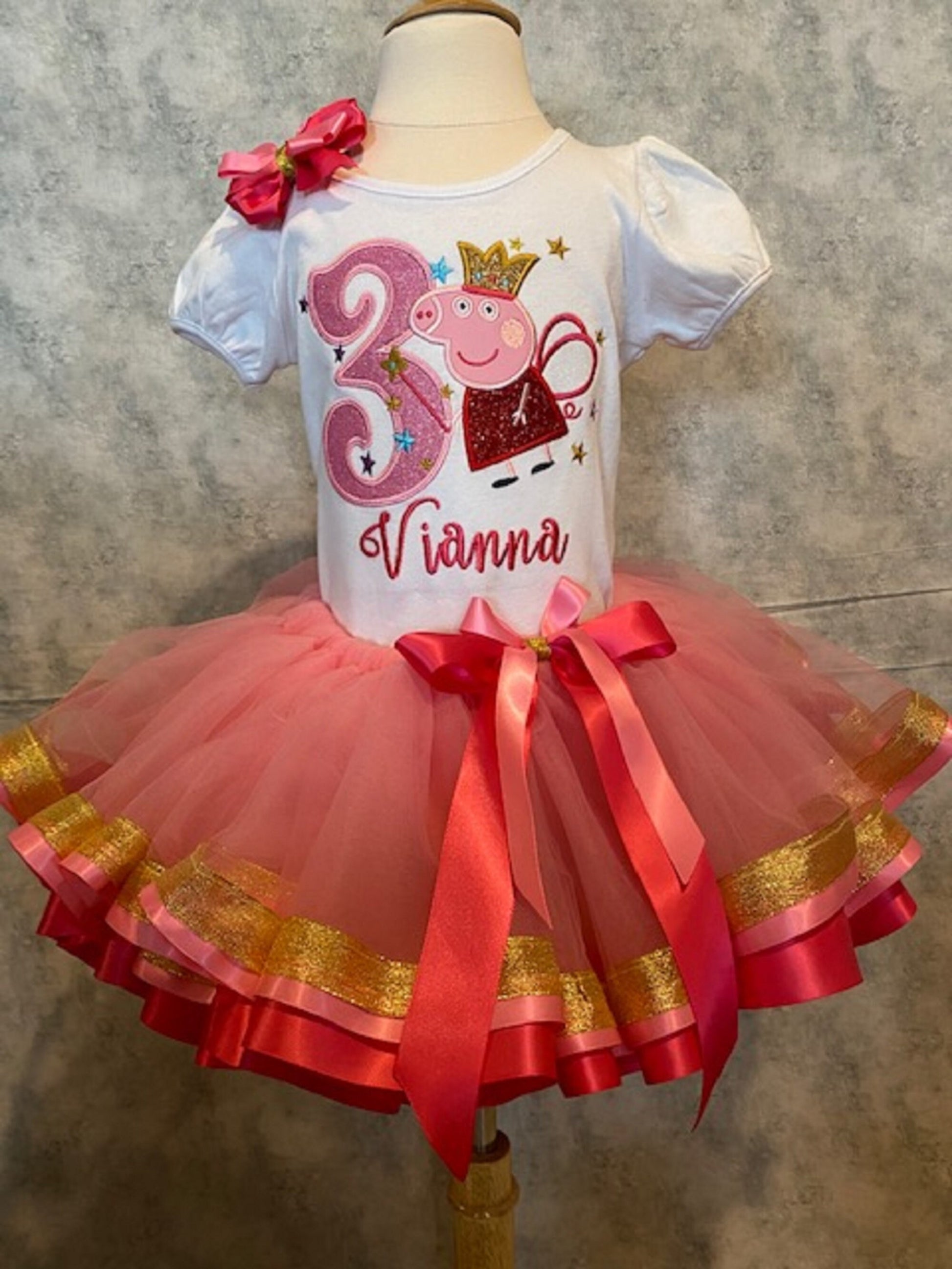 This cute Pink Pig Tutu features three different ribbons and the cutest ever Pink Pig shirt and matching hairbow making it SUPER CUTE! Shirt, Tutu, and Hairbow are also all available separately.