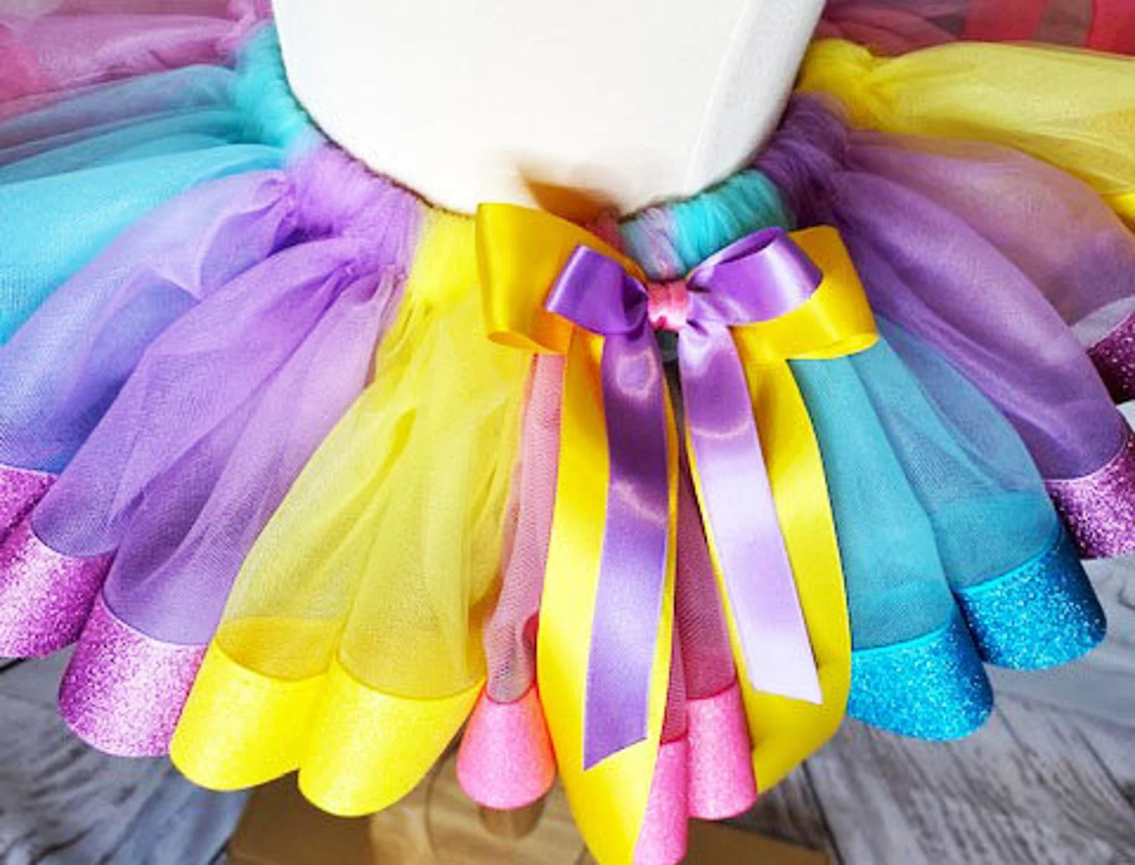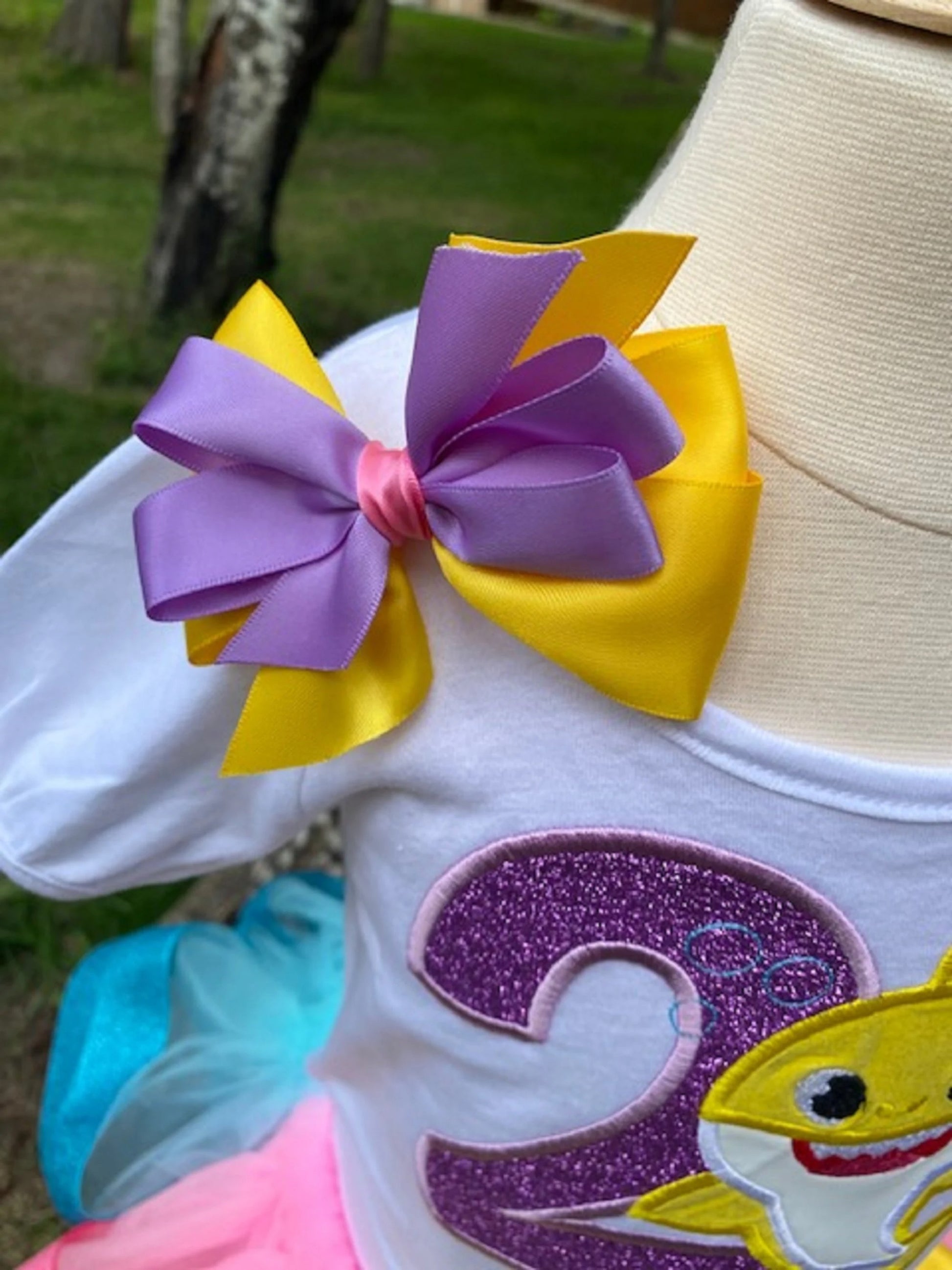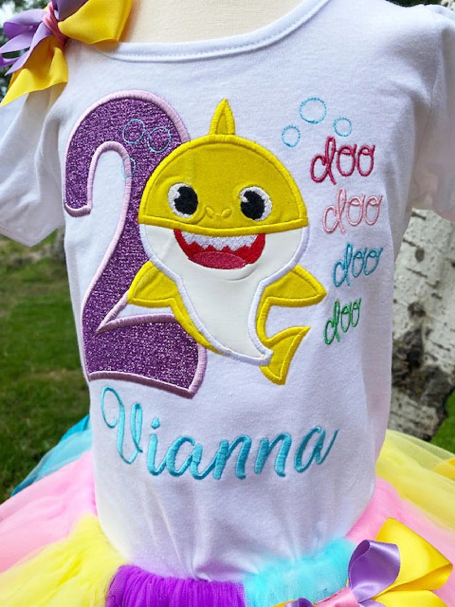This cute Tutu features an assortment of rainbow colors and a layer of matching ribbon making it the cutest ever shark outfit with matching hairbow! Shirt, Tutu, and Hairbow are also all available separately.